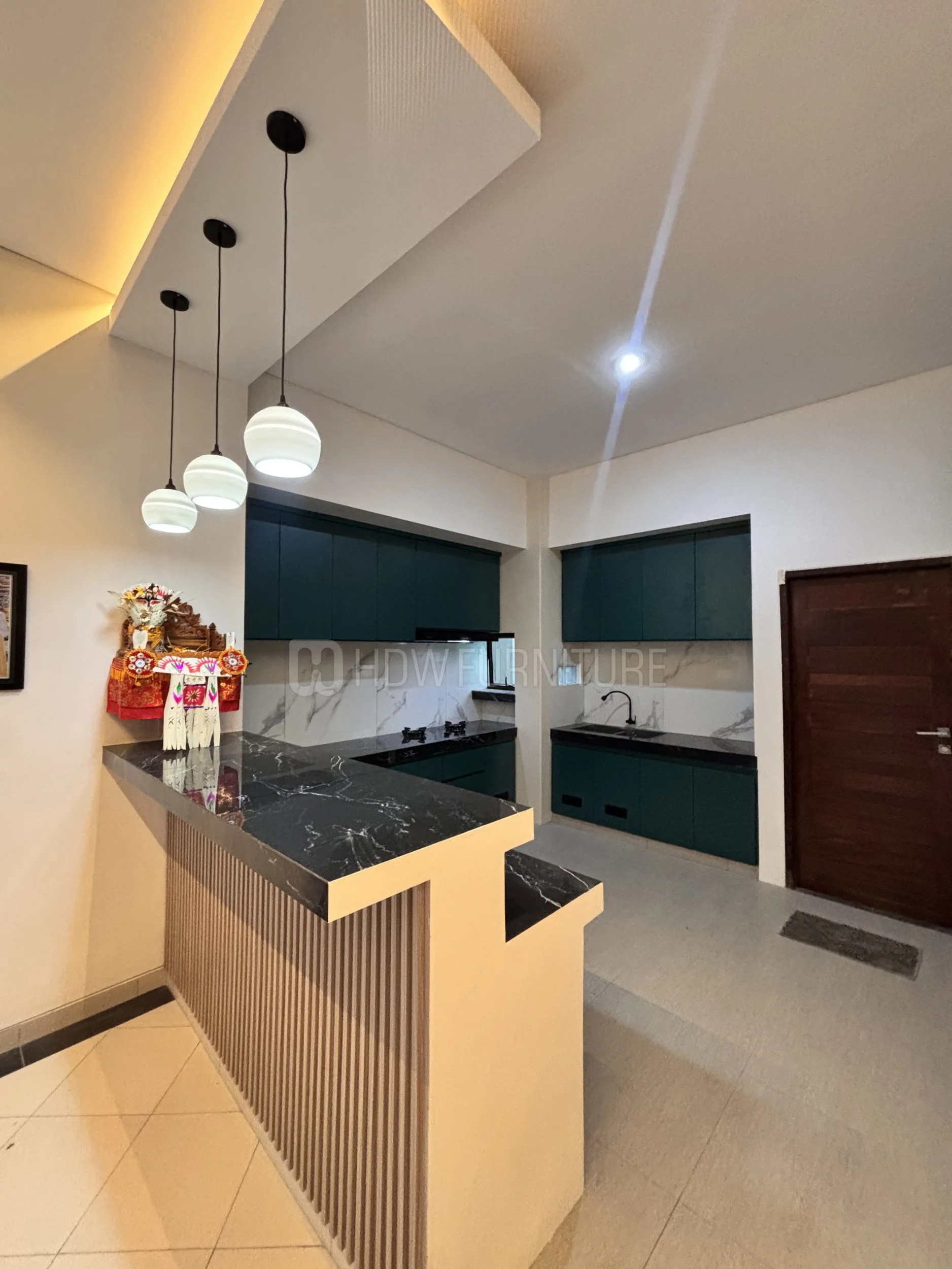 Bagian bawahnya dikasih aksen garis-garis vertikal, jadi nggak keliatan polos. Detail kecil, tapi ngaruh banget ke overall look. Naik ke atas, ada lampu gantung model bulat yang clean. Cahayanya hangat, bikin suasana dapur jadi lebih cozy, apalagi ditambah hidden lamp di plafon yang kasih efek glow halus.