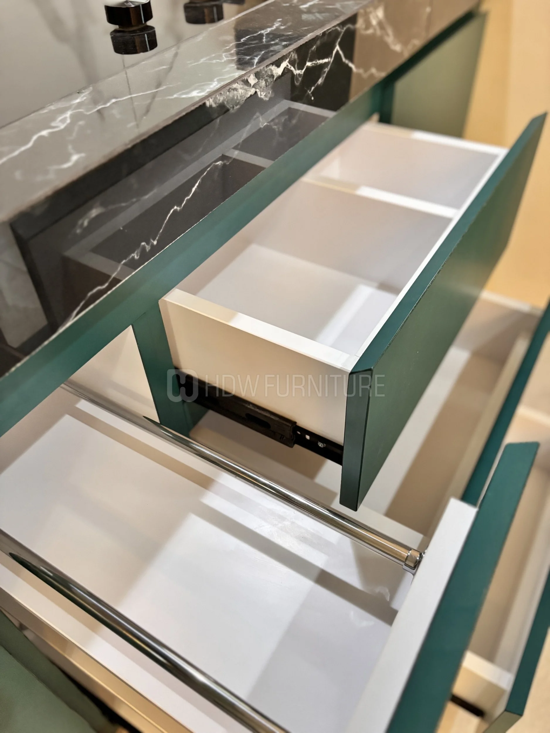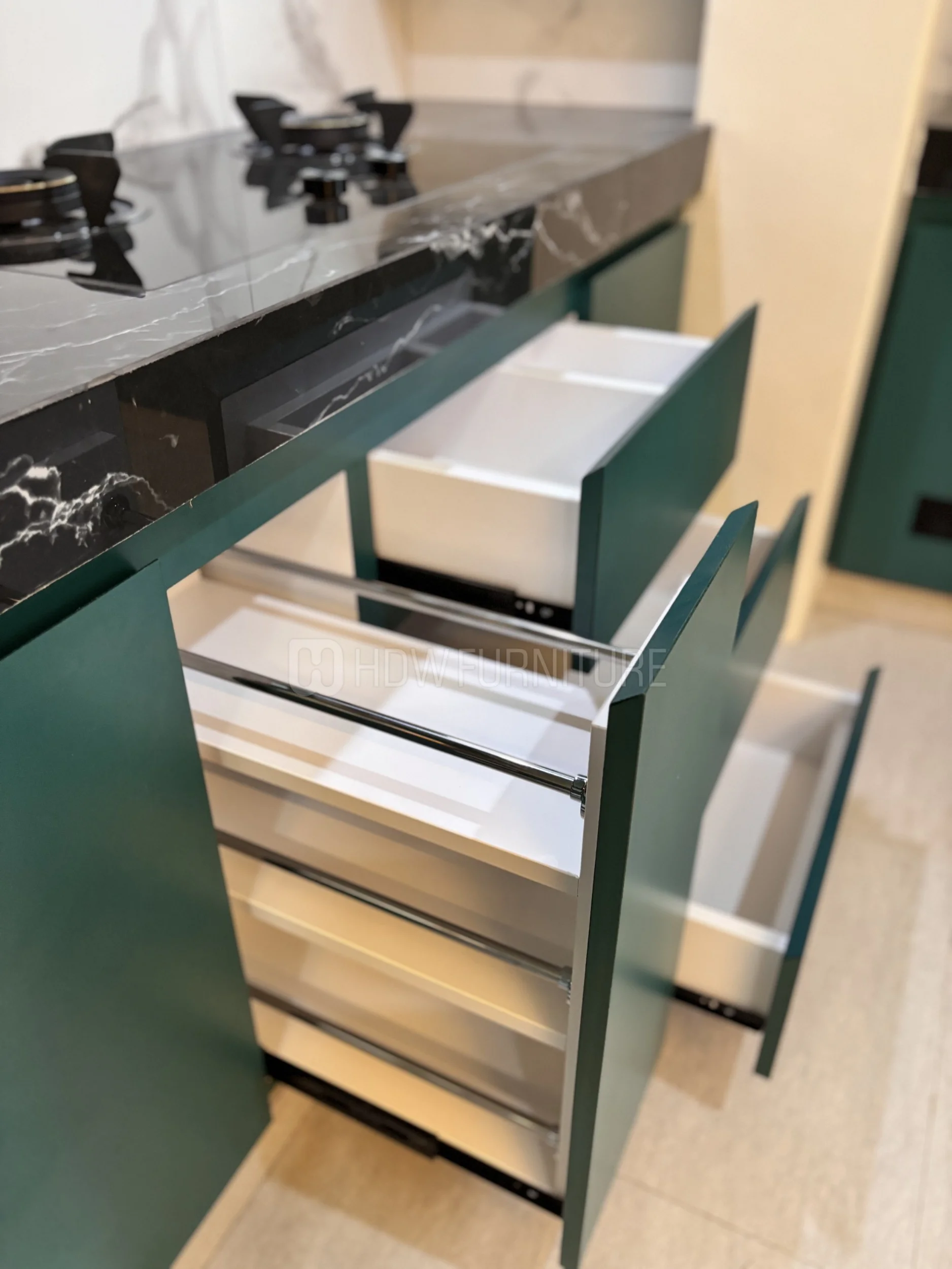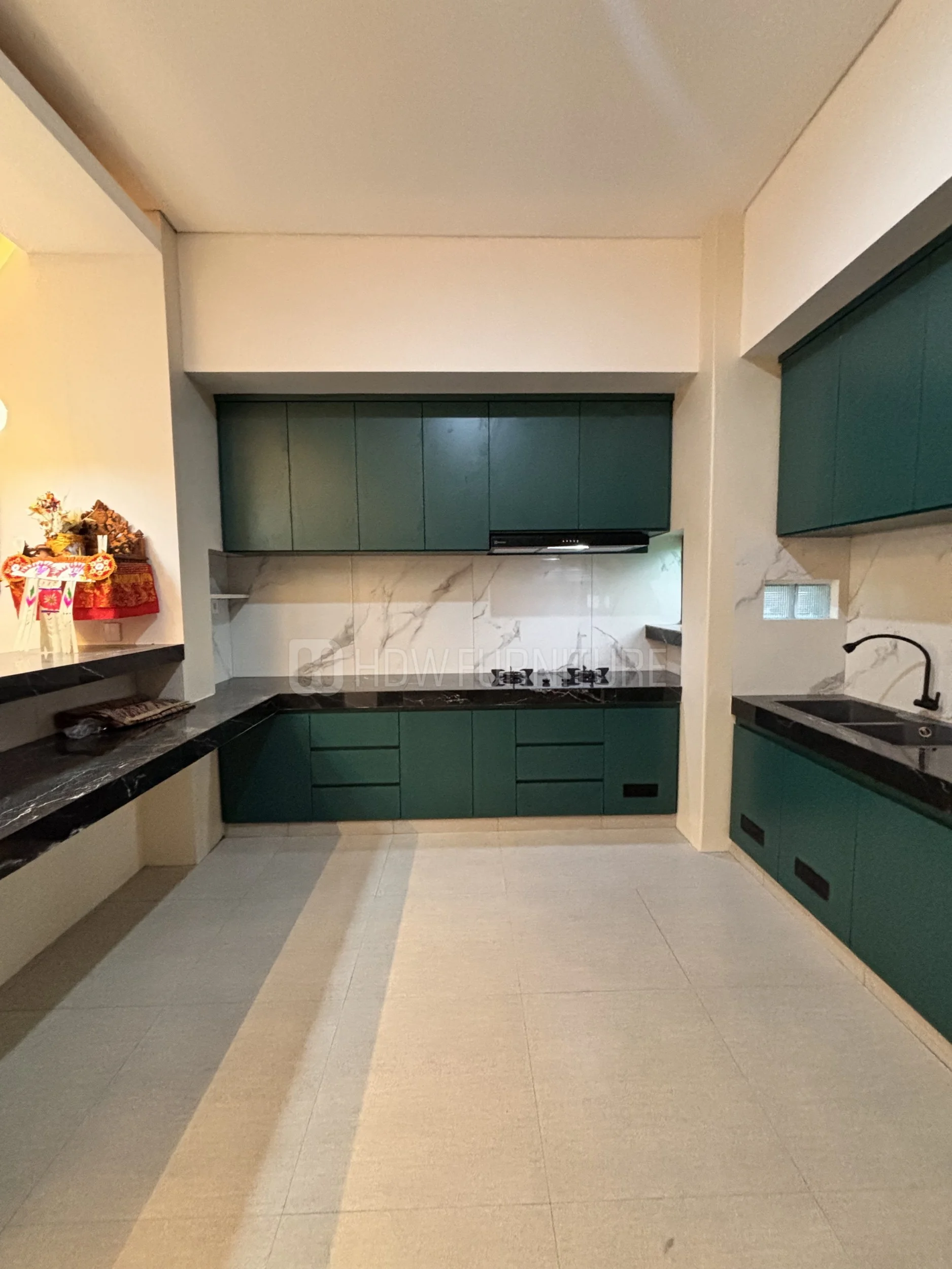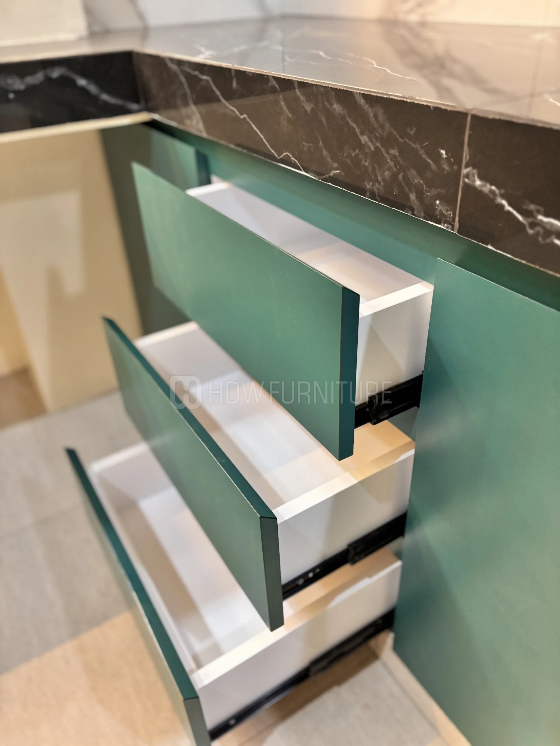 Masuk ke kabinet. Warna hijau tua ini cakep sih—nggak terlalu mencolok, tapi tetap punya karakter. Finishing-nya juga matte, jadi kelihatan lebih modern dan elegan.