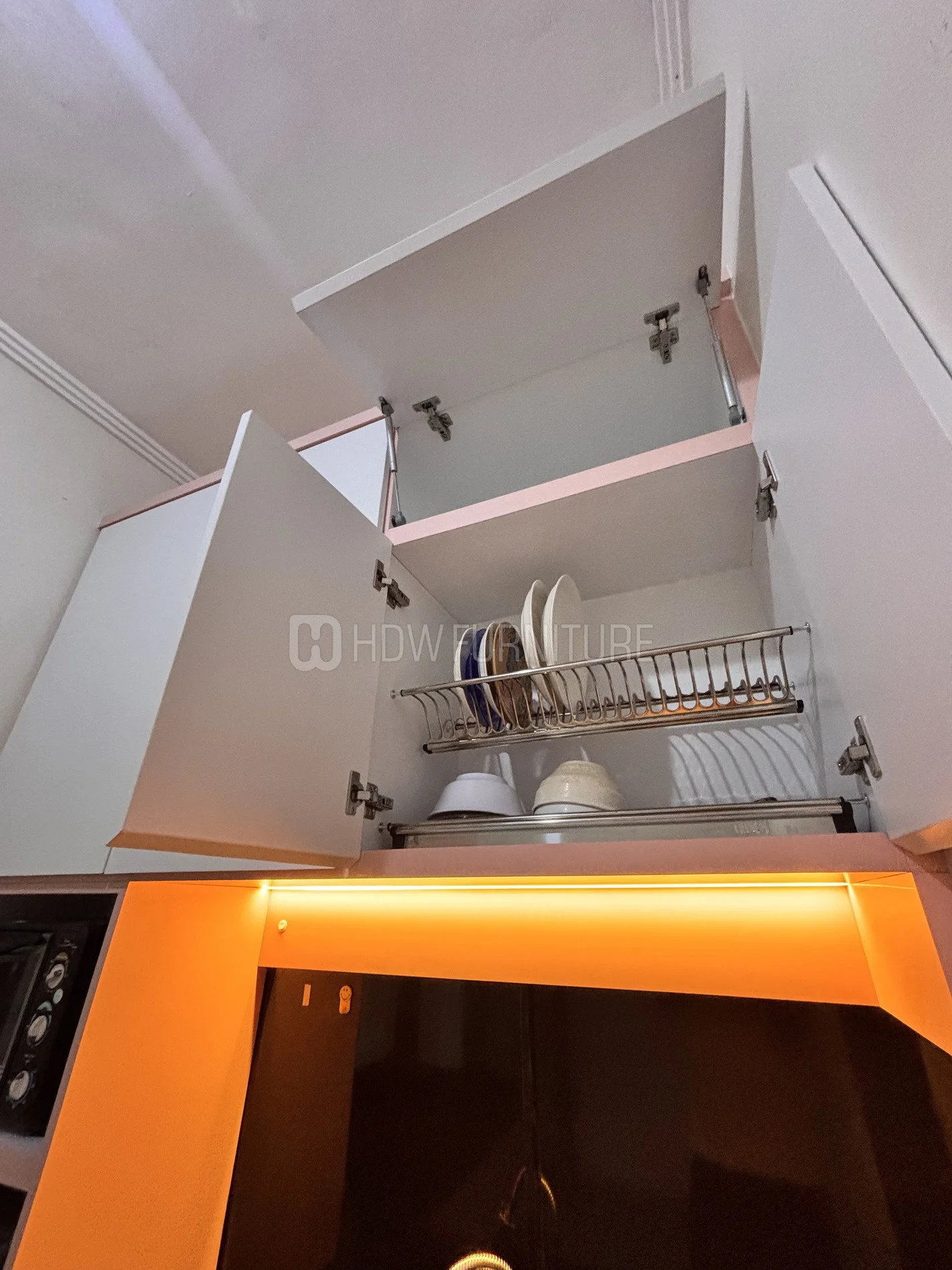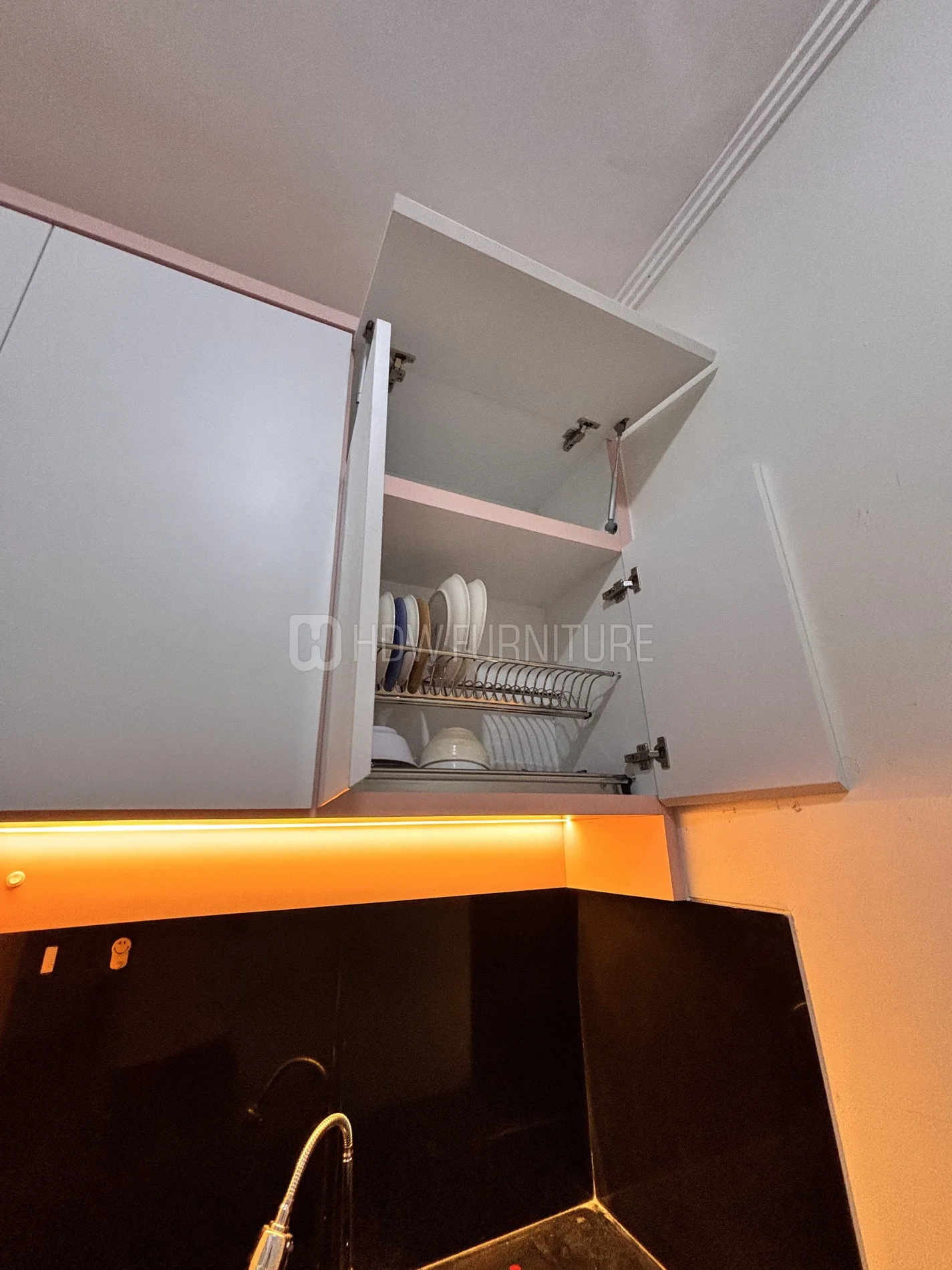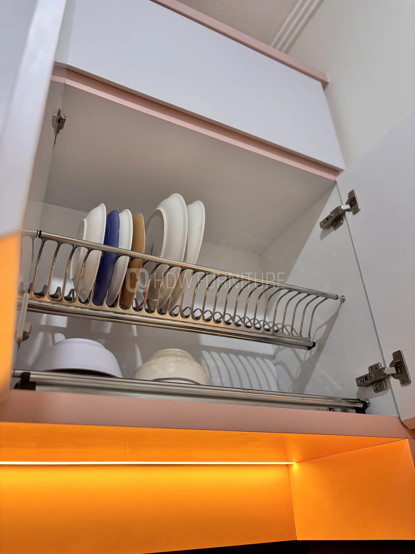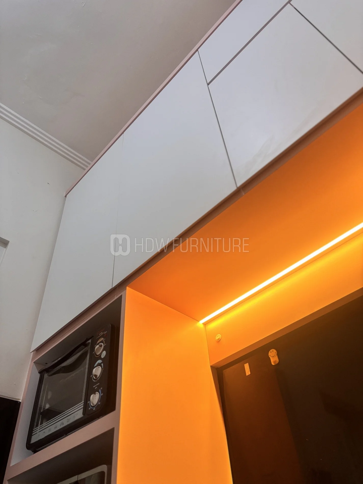 Elemen pencahayaan juga memberi sentuhan estetik yang kuat. Lampu LED warm tone yang dipasang di bawah kabinet atas menciptakan atmosfer hangat sekaligus menambah kenyamanan saat beraktivitas di dapur. Perpaduan warna lembut, elemen modern, dan pencahayaan yang hangat menjadikan kitchen ini tidak hanya fungsional, tetapi juga stylish dan nyaman digunakan sehari-hari.