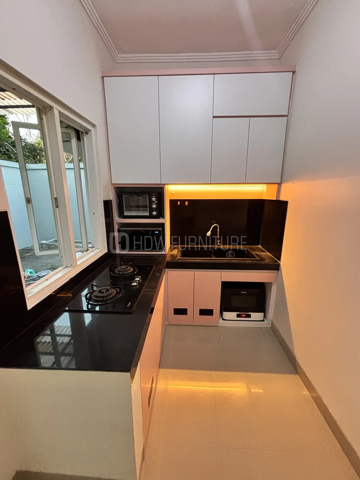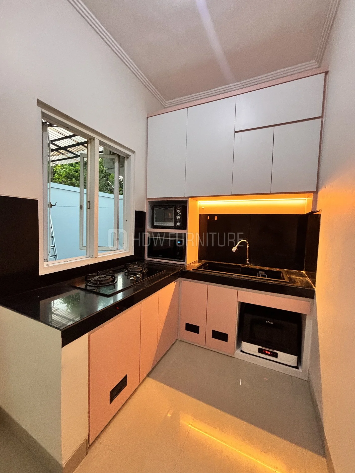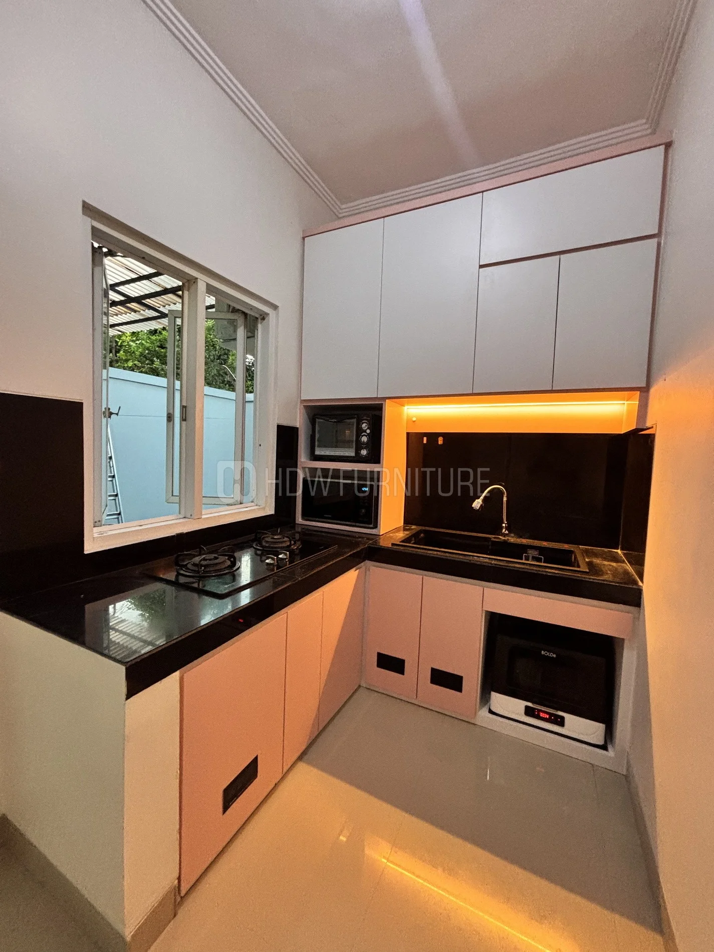 Kitchen ini menampilkan desain modern minimalis dengan bentuk layout L-shape yang fungsional dan efisien untuk memaksimalkan ruang. Pemilihan kombinasi warna putih pada kabinet atas dan soft pink pada kabinet bawah menghadirkan nuansa hangat serta lembut, dipadukan dengan top table hitam glossy yang memberi kesan elegan sekaligus kontras. Desain handle-less pada pintu kabinet membuat tampilan dapur terlihat rapi dan simpel.