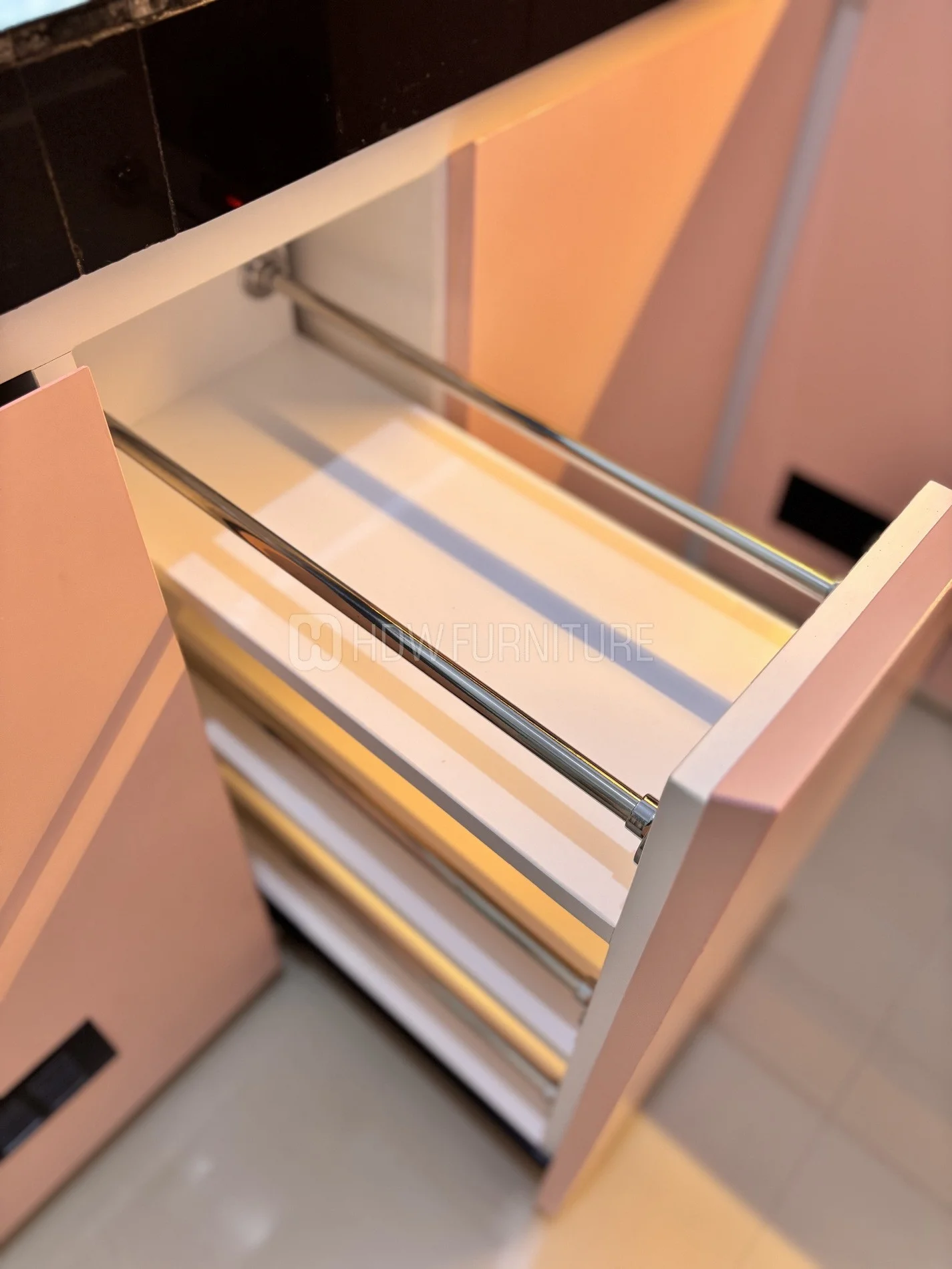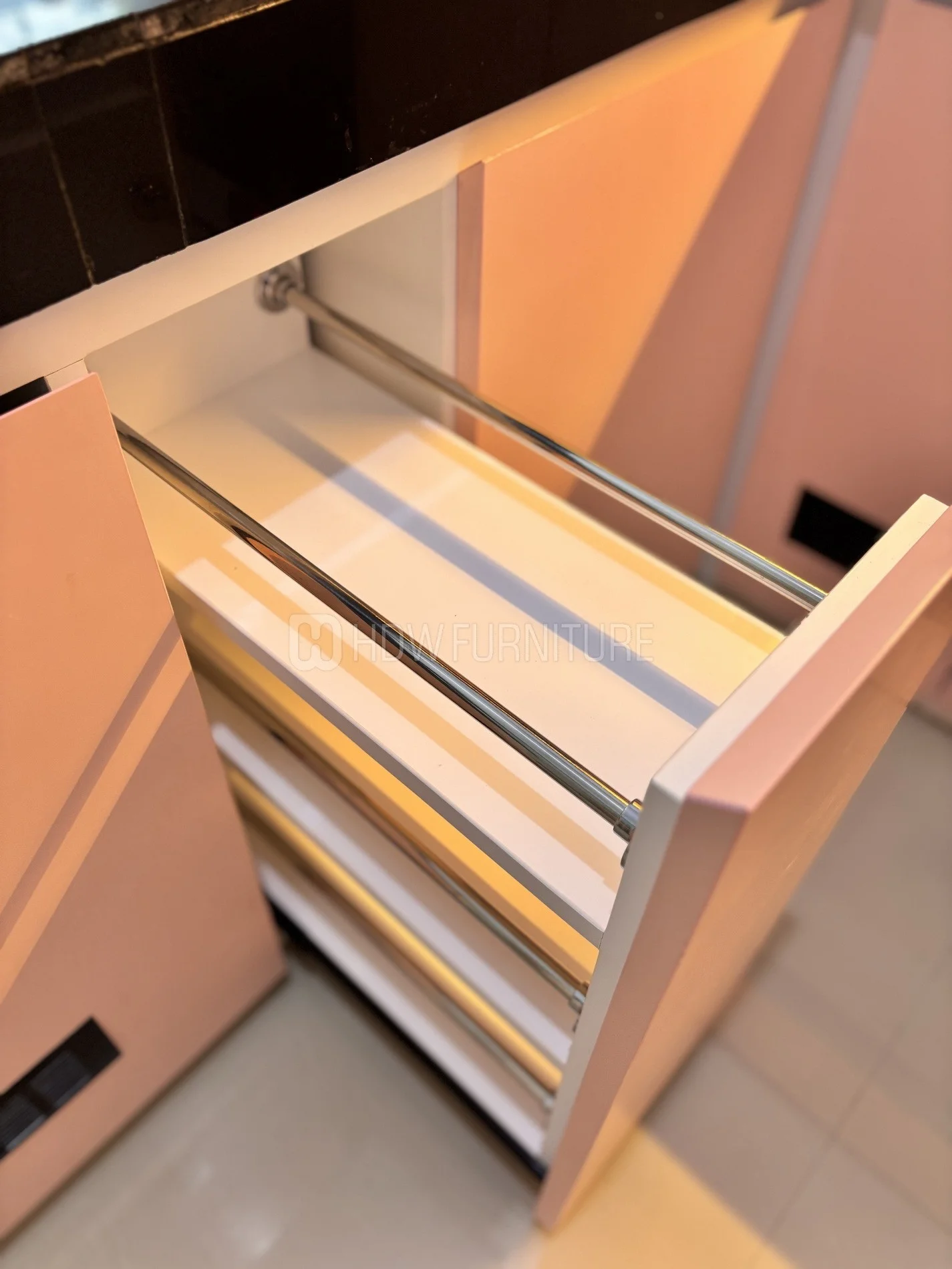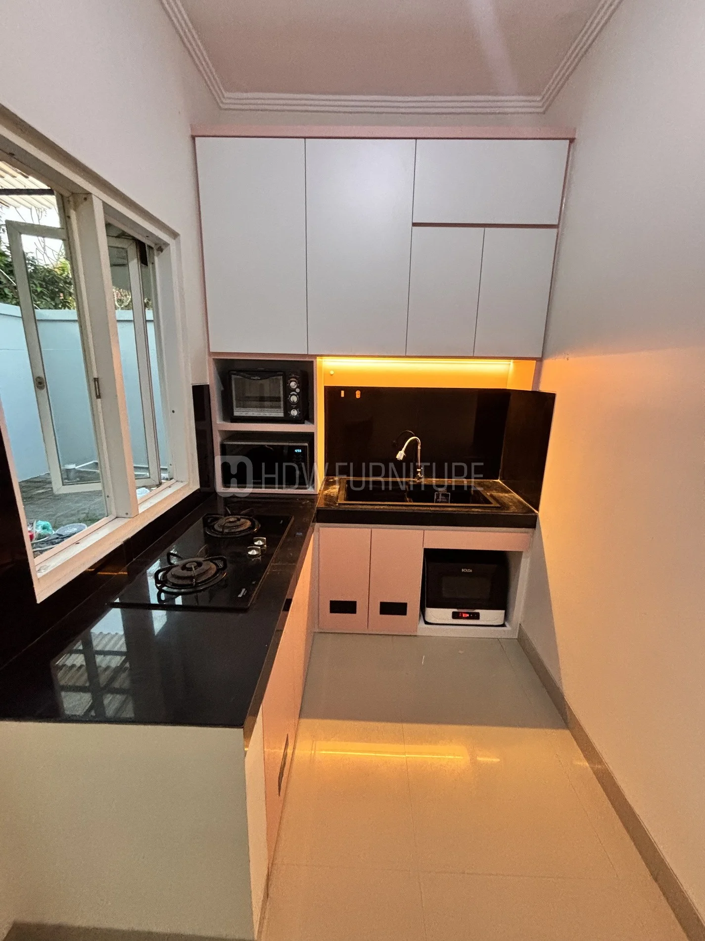 Kitchen ini menampilkan desain modern minimalis dengan bentuk layout L-shape yang fungsional dan efisien untuk memaksimalkan ruang. Pemilihan kombinasi warna putih pada kabinet atas dan soft pink pada kabinet bawah menghadirkan nuansa hangat serta lembut, dipadukan dengan top table hitam glossy yang memberi kesan elegan sekaligus kontras. Desain handle-less pada pintu kabinet membuat tampilan dapur terlihat rapi dan simpel.