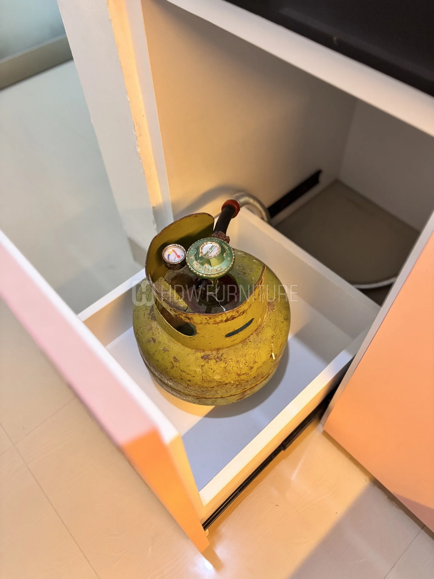 Dari sisi fungsi, kitchen ini dilengkapi kompor tanam dua tungku di sisi dekat jendela untuk sirkulasi udara yang lebih baik. Di area sudut terdapat sink dengan keran modern, sedangkan di bawahnya tersedia ruang untuk oven yang tertata rapi. Kabinet atas menyediakan ruang penyimpanan ekstra, termasuk rak khusus untuk microwave, sehingga peralatan dapur tertata dengan baik dan mudah diakses.