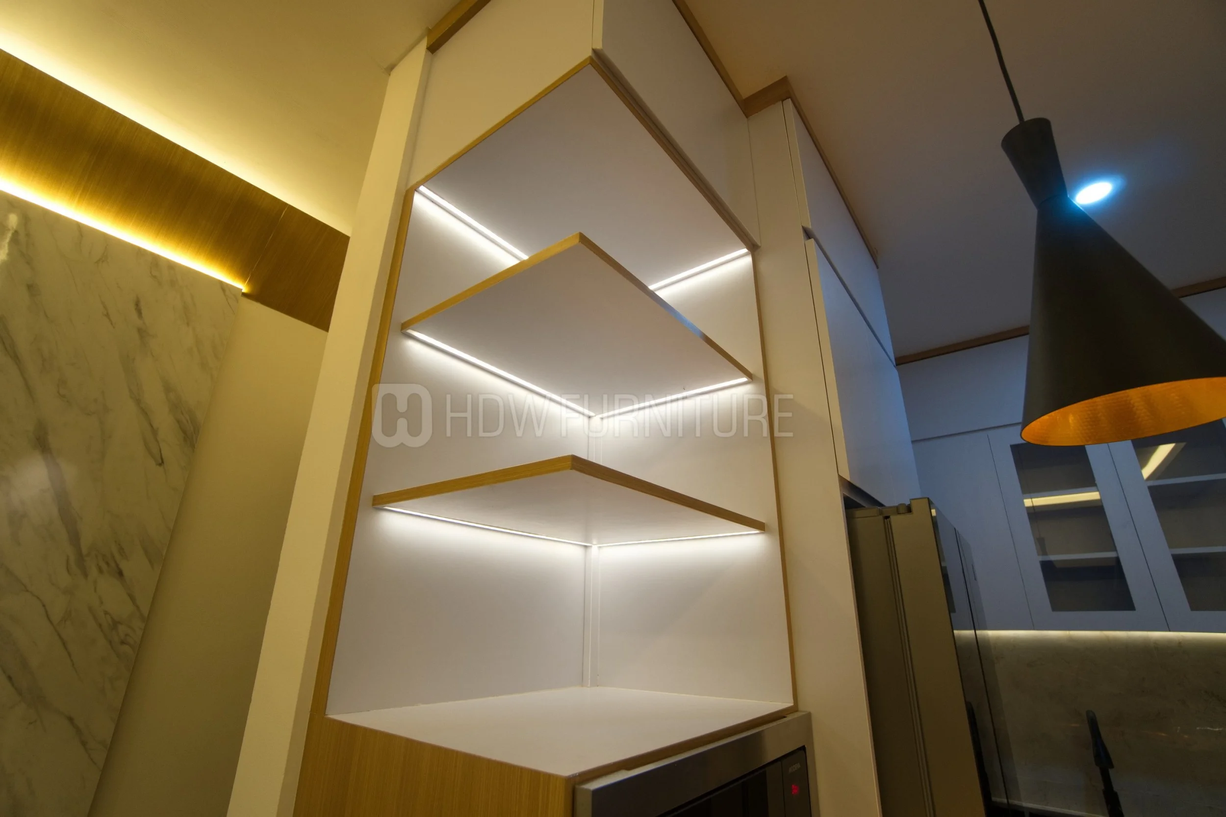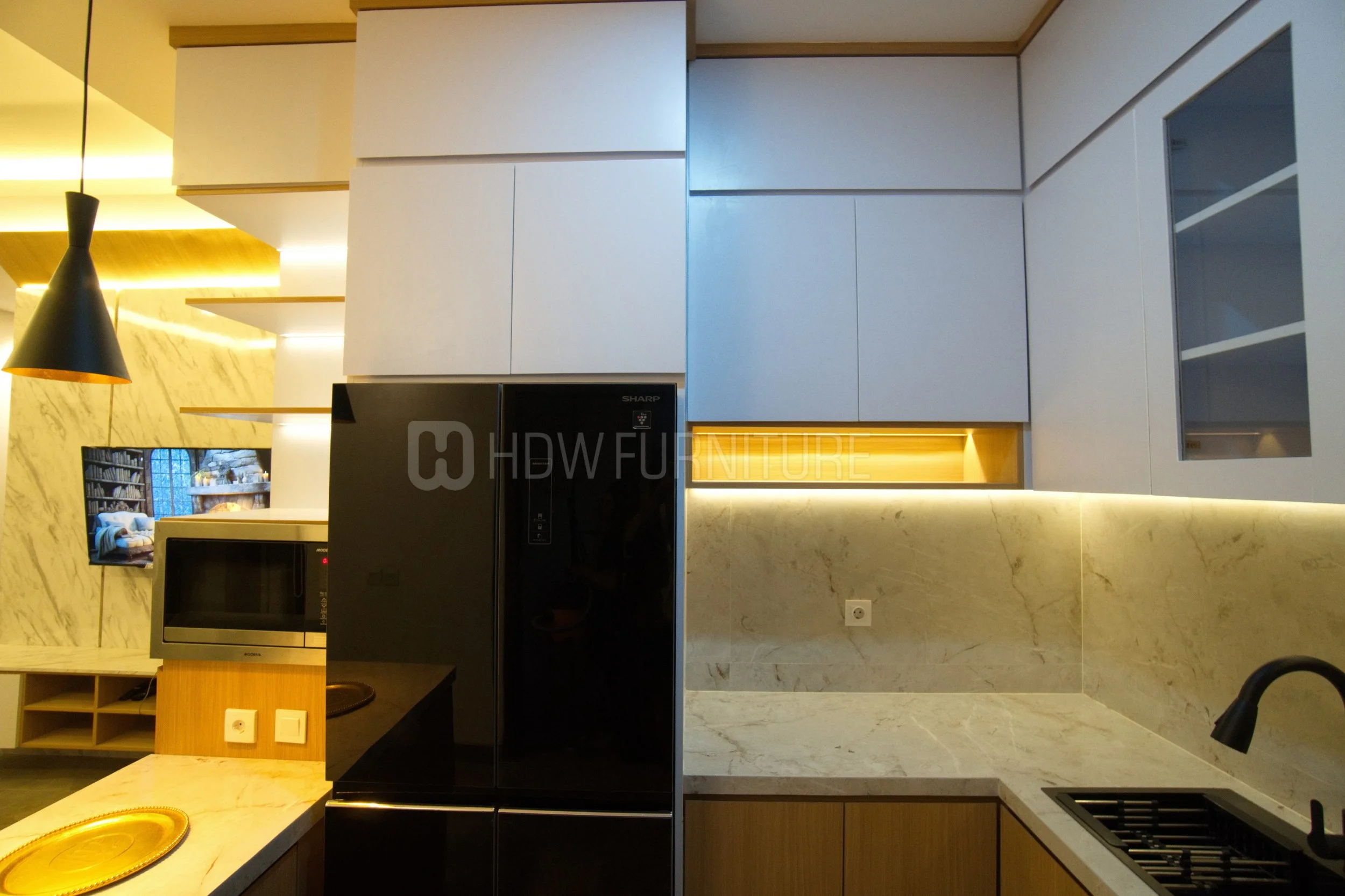 Pencahayaan jadi salah satu highlight di dapur ini. Hidden LED di bawah kabinet dan ambient lighting bikin suasana terasa hangat, sekaligus bantu visibilitas saat masak.