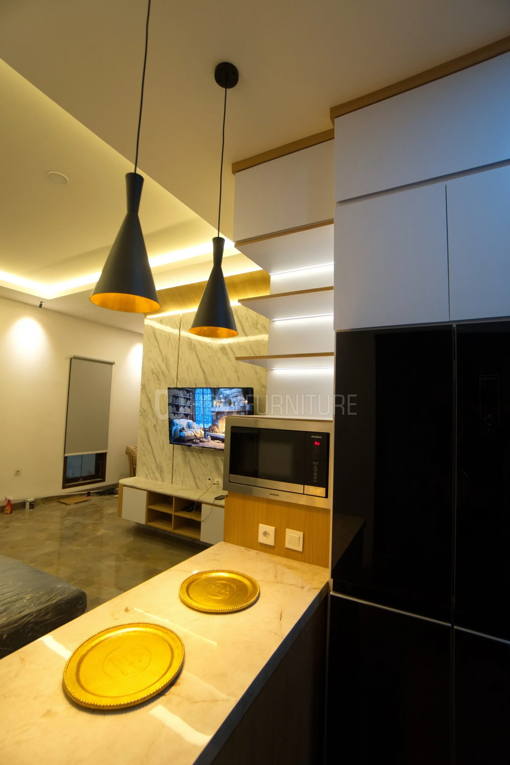 Semua appliance seperti microwave dan kulkas juga sudah built-in dengan rapi. Hasilnya, tampilan dapur jadi lebih clean, seamless, dan terasa premium.