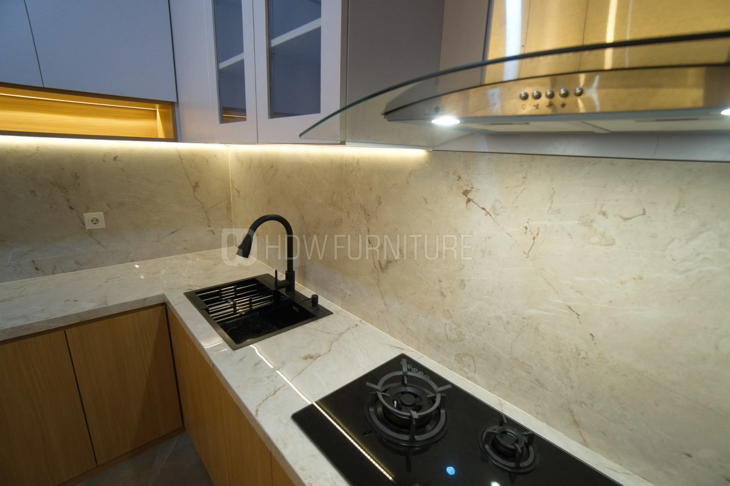 Di bagian belakang, backsplash motif marble kasih sentuhan elegan tanpa terkesan berlebihan. Selain cantik, juga praktis dan gampang dibersihkan untuk pemakaian sehari-hari.