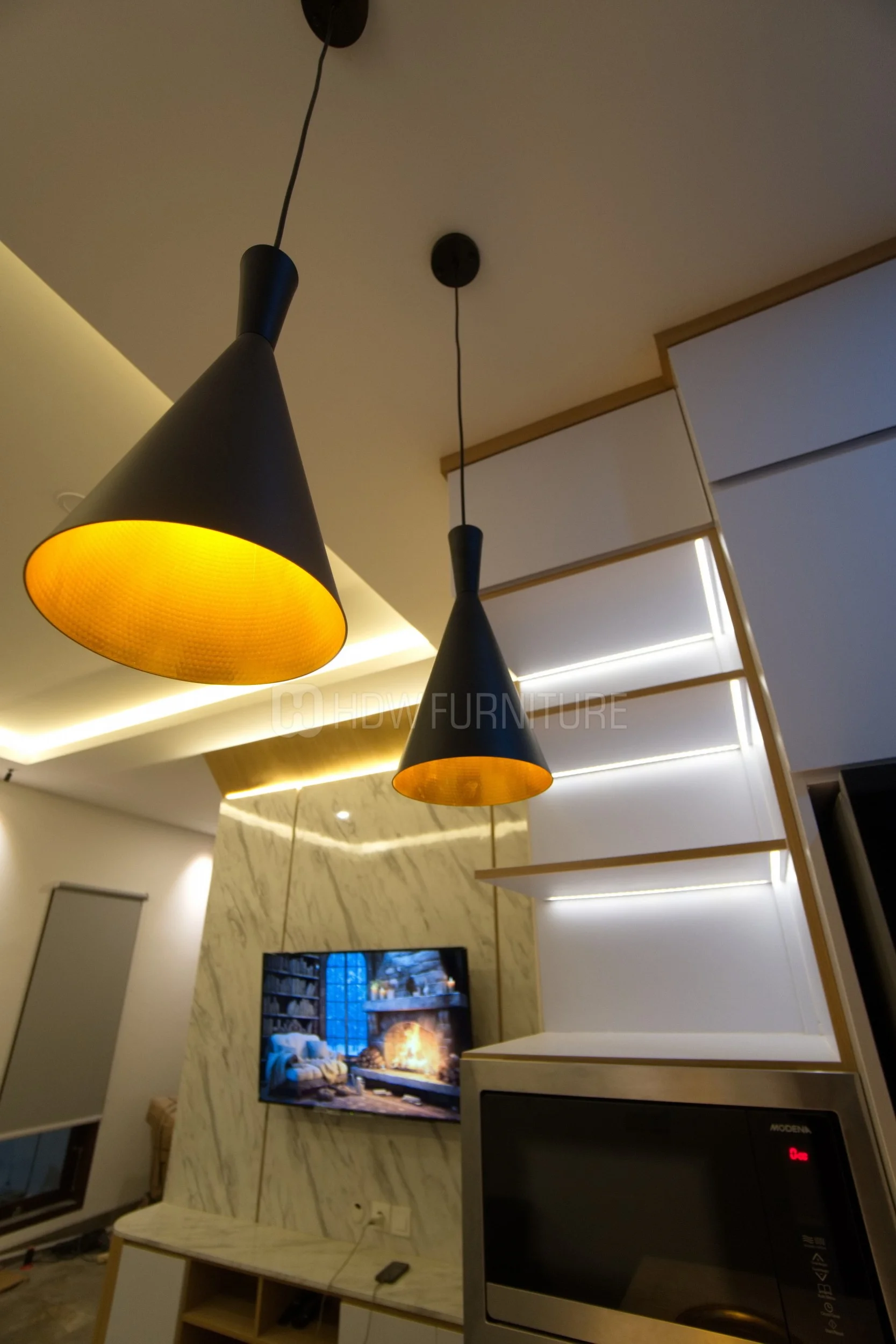 Lampu gantung di atas island jadi focal point yang langsung bikin ambience naik. Simple, tapi efeknya terasa banget.