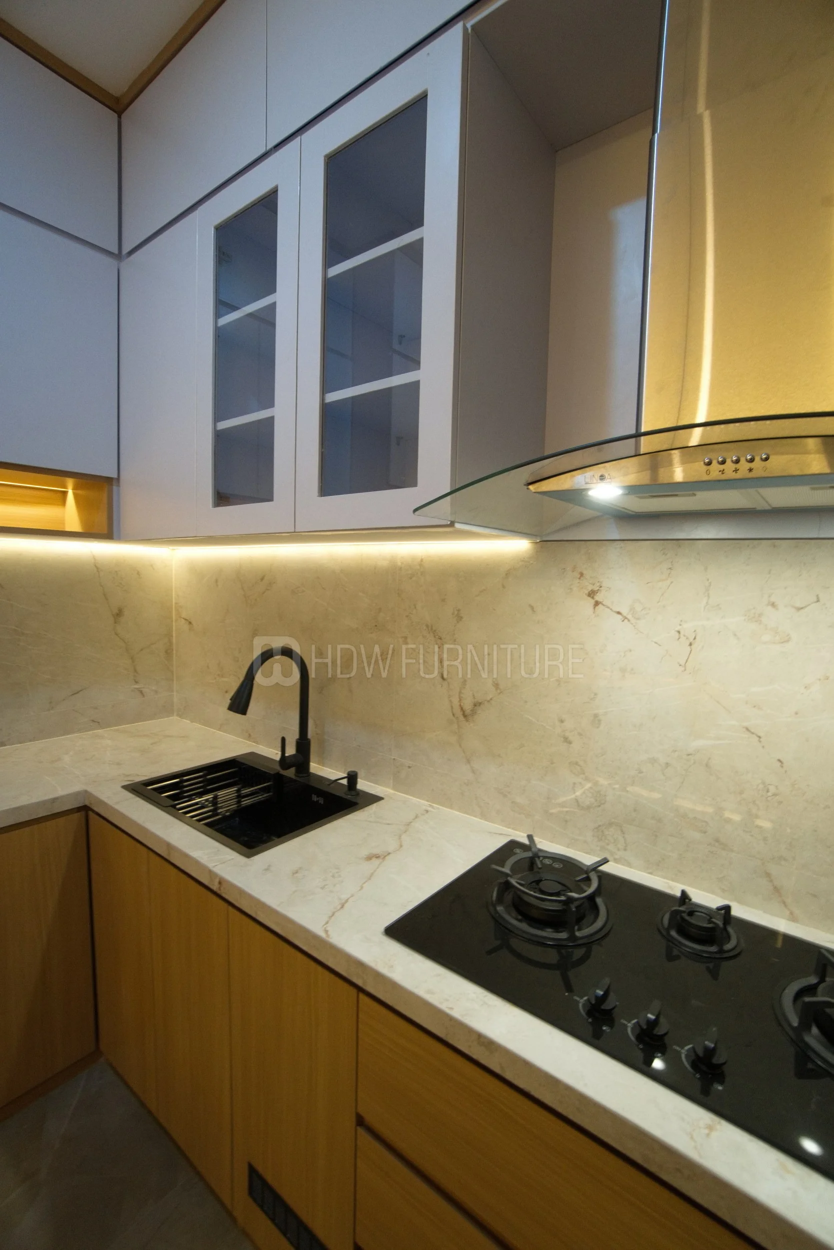 Kabinet atas dengan finishing putih dan aksen kaca bikin tampilan terasa ringan dan bersih. Nggak cuma fungsional buat storage, tapi juga menjaga dapur tetap terlihat luas.
